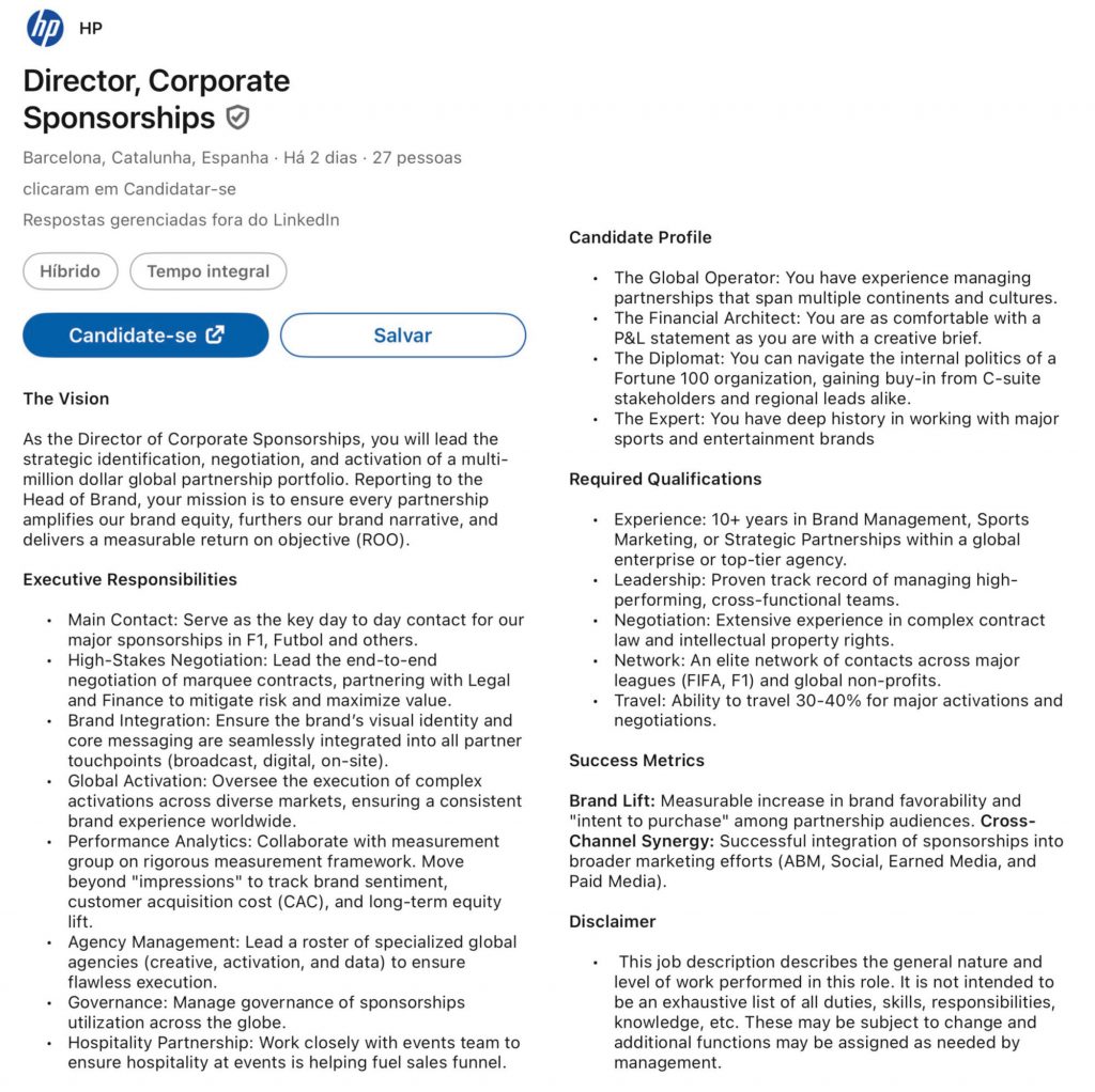 HP recently opened a vacancy for a Corporate Sponsorships Director.