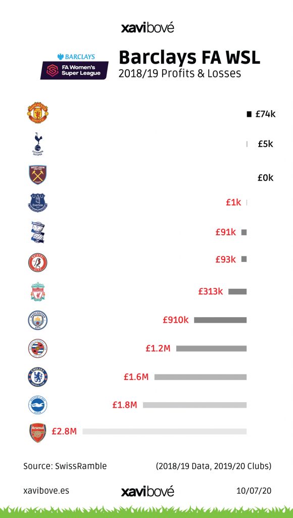 According to Swiss Ramble’s Twitter thread, 2018/19 numbers show how only West Ham, Manchester United and Tottenham Hotspur didn’t register operating losses, noting that the last two were playing in the FA Women’s Championship division. Big clubs like Arsenal and Chelsea lost £2.8 million and £1.6 million, respectively.