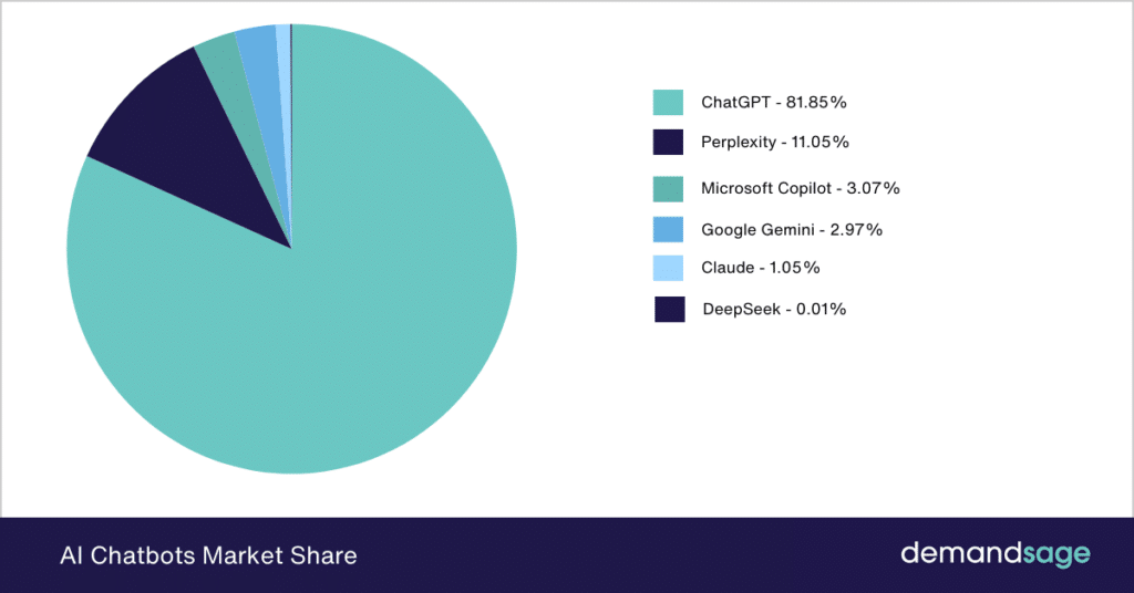 Hoy, ChatGPT lidera el mercado con un 82% de cuota, seguido por Perplexity (11%), Microsoft Copilot (3%) y Google Gemini (3%).