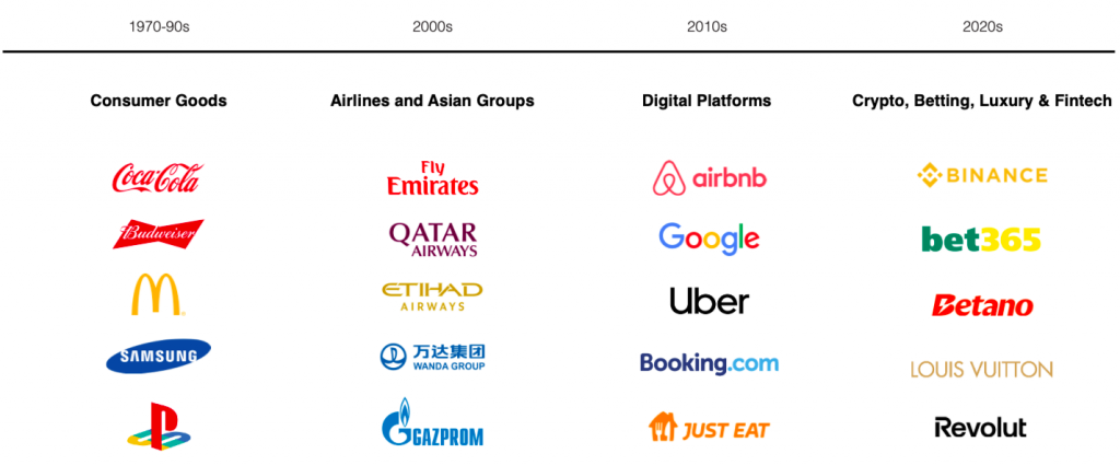Con el crecimiento de las economías emergentes, aerolíneas y conglomerados asiáticos como Emirates, Qatar Airways, Etihad, Wanda Group y Gazprom utilizaron el patrocinio como herramienta de posicionamiento y credibilidad internacional.