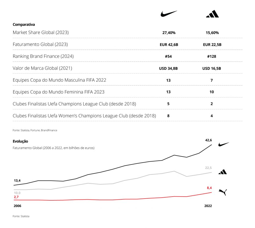 Ao comparar as empresas americanas e alemãs de vestuário e calçado desportivo, a Nike domina a nível empresarial, de marca e de futebol.